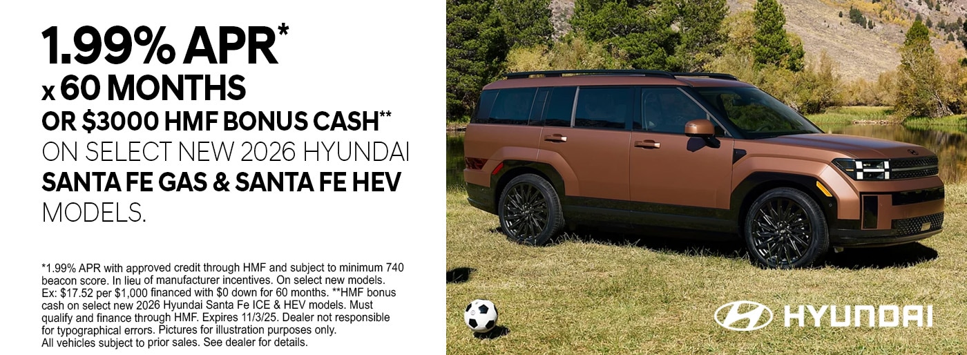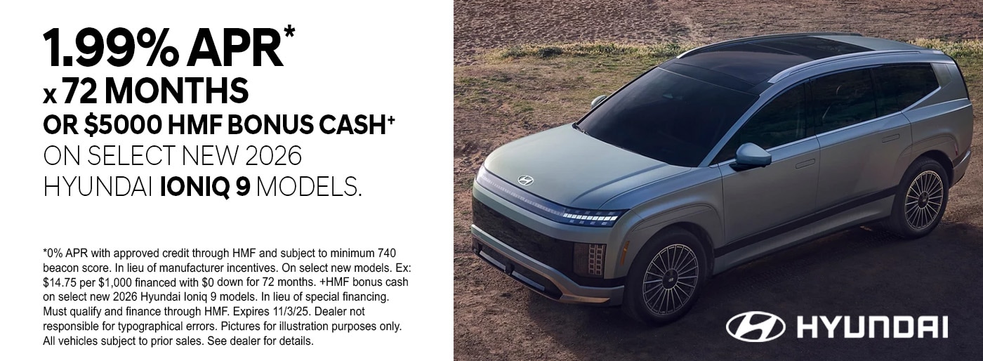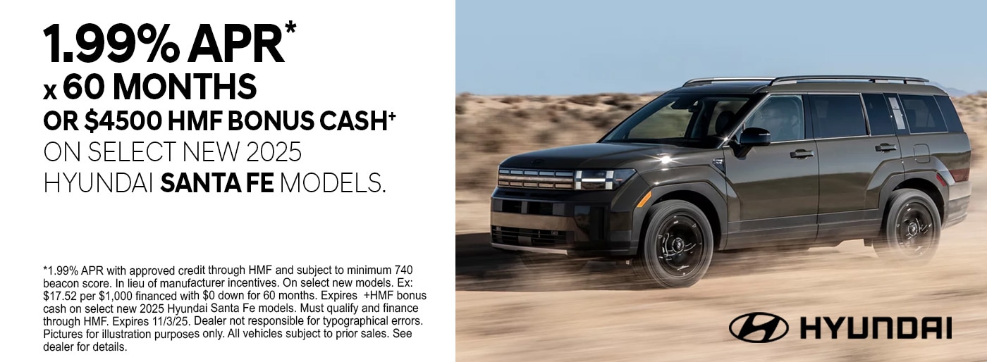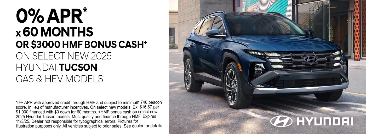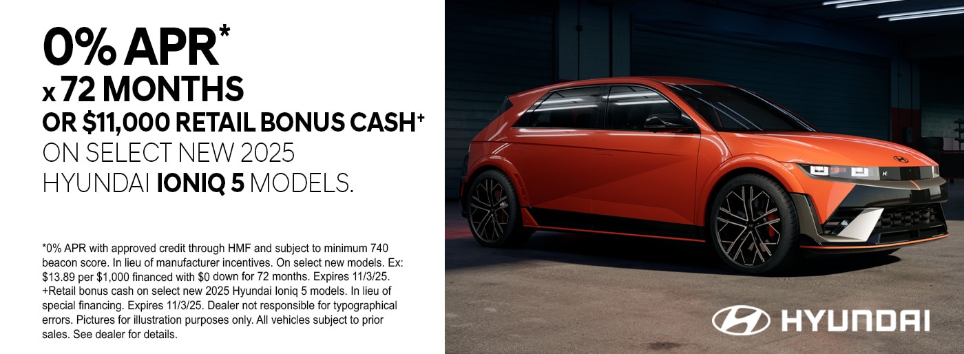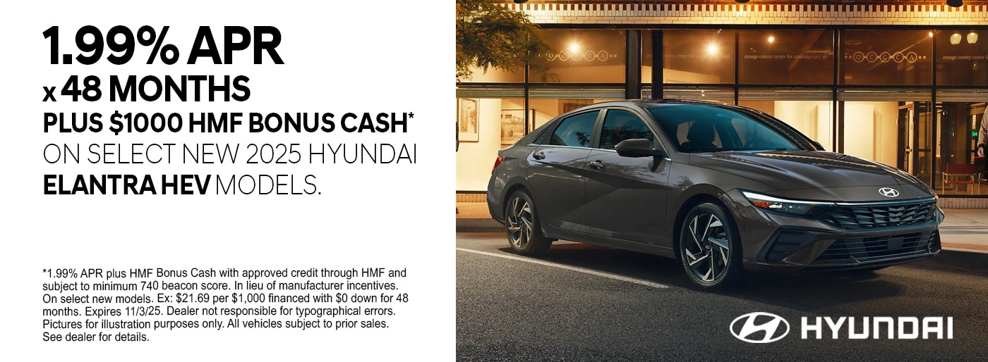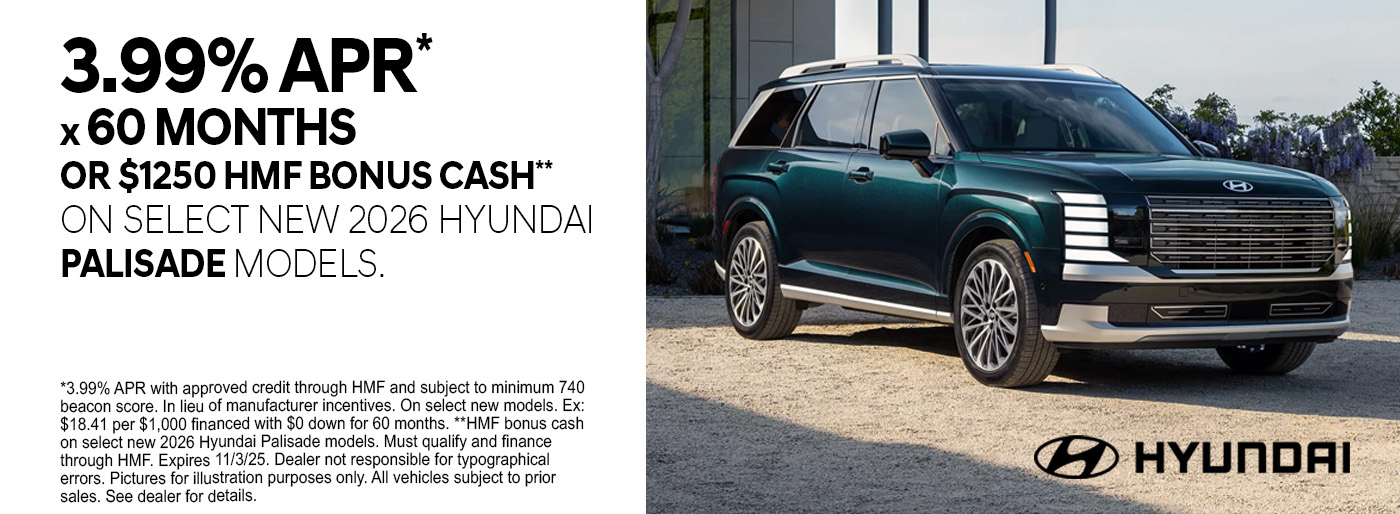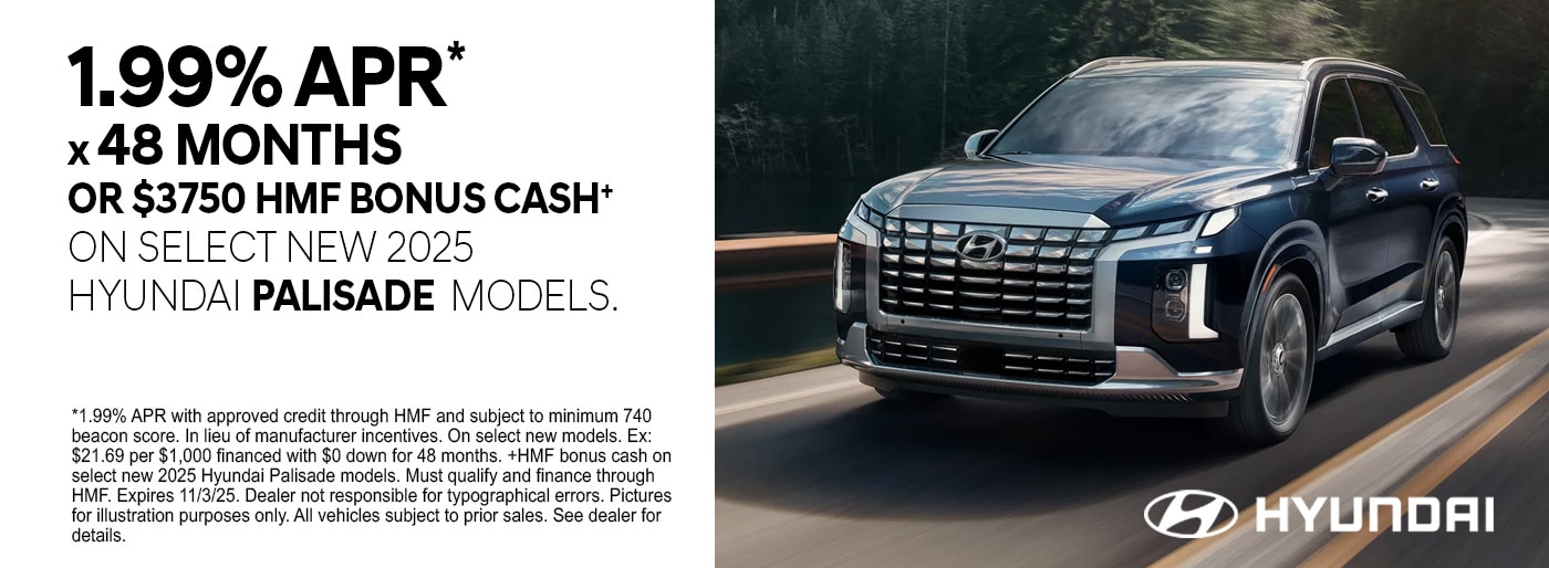 Dealer not responsible for typographical errors. Pictures are for illustration purposes only. All vehicles subject to prior sales. See dealer for details. MSRP may not be price at which vehicle is sold in trade area. New car prices include applicable manufacturer incentives in lieu of special financing. Plus tax, title, destination fee, registration fees & $251.05 doc fee. For In-Transit Inventory, any date of arrival is estimated. The actual date of delivery may vary due to circumstances beyond Hyundai and the dealer’s control. Contact dealer for additional information. New vehicle MPG’s are EPA’s estimated highway MPG’s. New vehicle MPGe/EPA Range Rating are based on EPA Range Rating. See dealer for copy of limited warranty. Used car prices plus tax, title, registration fees & $251.05 doc fee. Used car MPG/MPGe/EPA Range Rating claims are based on EPA estimated city and highway ratings when vehicle was new. Consumers actual mileage will vary. The value of used vehicles varies with mileage, usage and condition. Book values should be considered estimates only. Price includes incentive from HMF. May require financing.