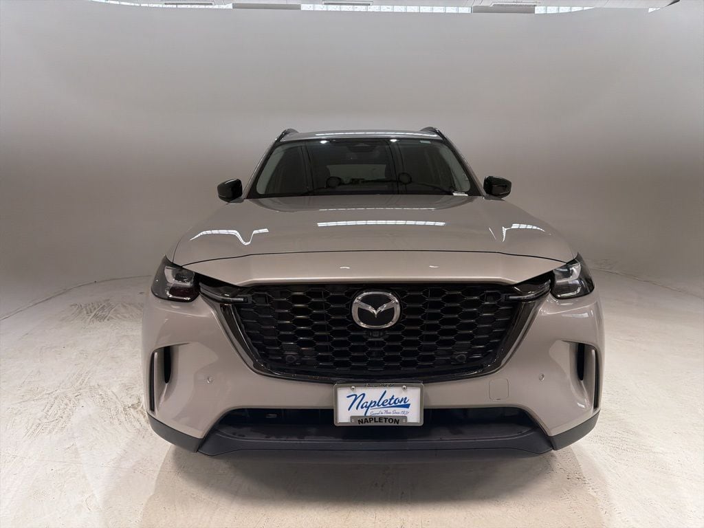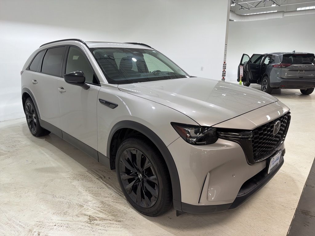 This Mazda CX-90 is well equipped with 12 Speakers, 2nd-Row Captain's Chairs, 3rd row seats: bench, AM/FM radio: SiriusXM, Auto-dimming Rear-View mirror, Automatic temperature control, Compass, Dual front impact airbags, Dual front side impact airbags, Emergency communication system: MAZDA CONNECT, Exterior Parking Camera Rear, Front anti-roll bar, Front dual zone A/C, Fully automatic headlights, Garage door transmitter: HomeLink, Heads-Up Display, Heated door mirrors, Heated Front Bucket Seats, Illuminated entry, Infotainment System Voice Command, Knee airbag, Leather Seat Trim, Low tire pressure warning, Mazda Navigation System, Memory seat, Navigation system: MAZDA CONNECT, Occupant sensing airbag, Outside temperature display, Overhead airbag, Power door mirrors, Power driver seat, Power Liftgate, Power passenger seat, Radio: AM/FM w/HD/Bose 12-Speaker Sound System, Rear air conditioning, Rear window wiper, Steering wheel mounted audio controls, Tachometer, Telescoping steering wheel, Tilt steering wheel, Trip computer, Wheels: 21" x 9.5J Aluminum Alloy, 4-Wheel Disc Brakes, ABS brakes, Air Conditioning, Auto High-beam Headlights, Brake assist, Color Match Body Molding, Delay-off headlights, Driver door bin, Driver vanity mirror, E911 Automatic Emergency Notification, Electronic Stability Control, Four wheel independent suspension, Front Bucket Seats, Front Center Armrest w/Storage, Front reading lights, Heated front seats, Leather Shift Knob, Leather steering wheel, Mazda Connected Services, Overhead console, Pandora Internet Radio Integration, Panic alarm, Passenger door bin, Passenger vanity mirror, Power steering, Power windows, Radio Broadcast Data System Program Information, Radio data system, Rain sensing wipers, Rear anti-roll bar, Rear reading lights, Rear seat center armrest, Rear window defroster, Remote keyless entry, SMS Text Msg Audio Delivery & Reply, Speed control, Speed-sensing steering, Split folding rear seat, Spoiler, Traction control, Turn signal indicator mirrors, and Variably intermittent wipers.